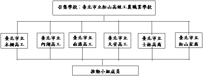 本組召集學校由臺北市立松山工農擔任,推動小組成員包括各校教務主任、教學組組長、相關業務組長或承辦人員組成,共同推動教務工作組各項計畫與商討困難解決策略。組織架構如下: